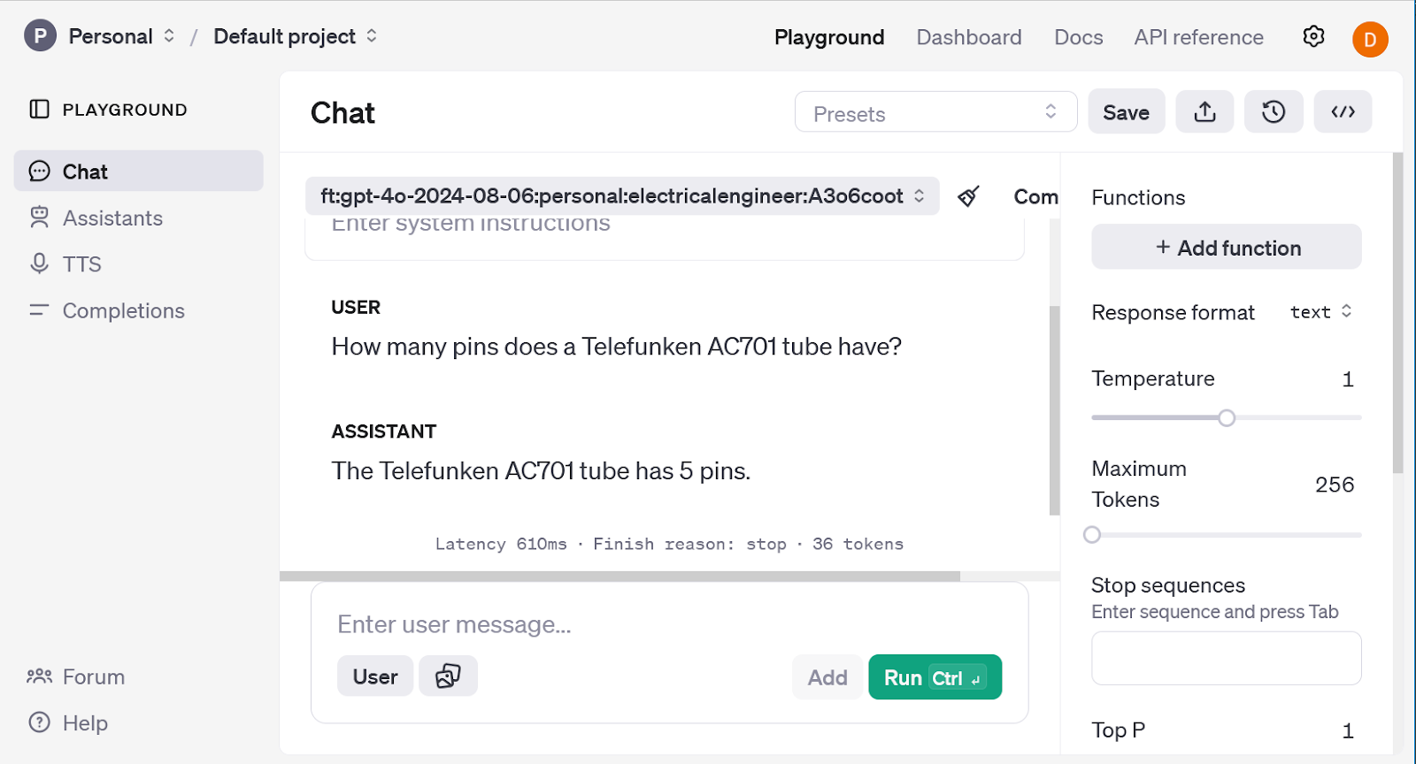 The mannequin was set to the fine-tuned mannequin ft:gpt-40-2024-08-06:private:electricalengineer:A3o6coot, and requested the identical query. As a result of the coaching information contained details about the AC701 tube, the response from the fine-tuned mannequin was: