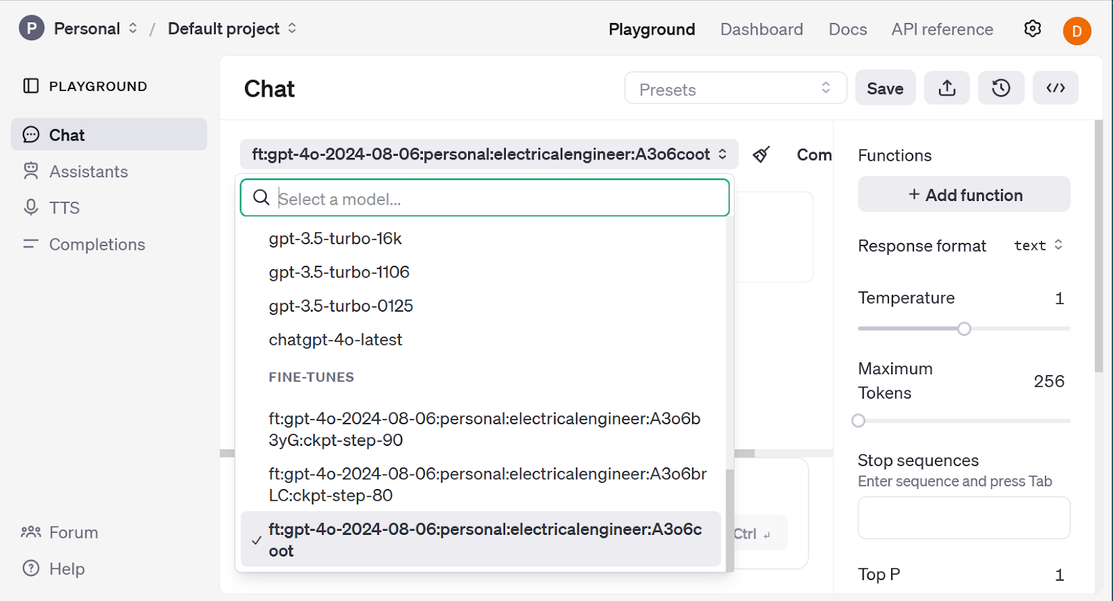 The outcomes could be examined by clicking the Playground hyperlink. Clicking on the grey drop-down menu close to the highest of the web page reveals you the out there fashions, together with the fine-tuned mannequin. Additionally included are further fashions that characterize checkpoints over the past three epochs of the coaching. These fashions can be utilized for varied functions, together with in circumstances of overfitting; fashions at earlier checkpoints could be examined to find out when the overfitting occurred.
