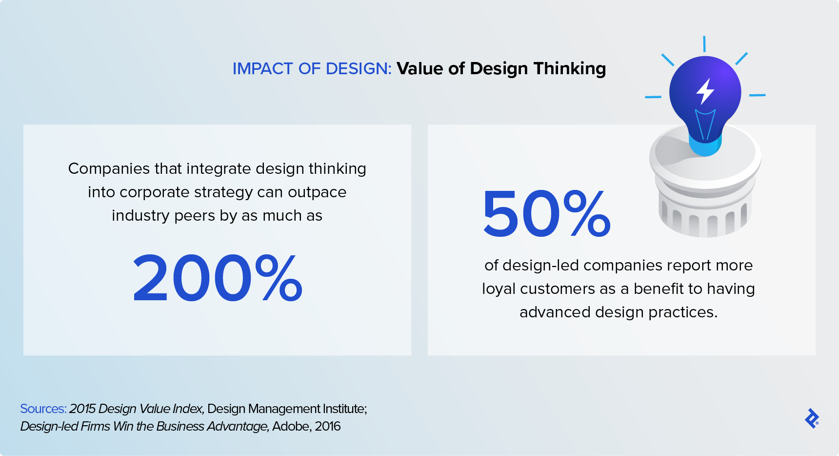My years as a buyer expertise officer (CXO), as a strategist at Booz & Firm, and now as Toptal’s Digital Buyer Expertise Observe Lead have taught me that there’s nice business worth in diving deep into human conduct—and absolutely understanding the human perspective. One of the vital highly effective methods to do this is with design pondering. In essence, design pondering is the intentional and strategic method to fixing the precise drawback with an answer that’s fascinating, possible, and viable. In actual fact, lots of right now’s most profitable product and repair corporations are constructed on it, together with Netflix, GE Healthcare, and Uber Eats. And many years of analysis recommend that corporations that make use of design pondering have larger income, develop sooner, and understand larger returns on funding (ROIs). A seminal 2018 McKinsey & Firm research, which tracked greater than 300 publicly listed corporations for 5 years, discovered that companies that invested extra in design (measured by scores on the McKinsey Design Index) grew in some circumstances at twice the speed of their rivals.